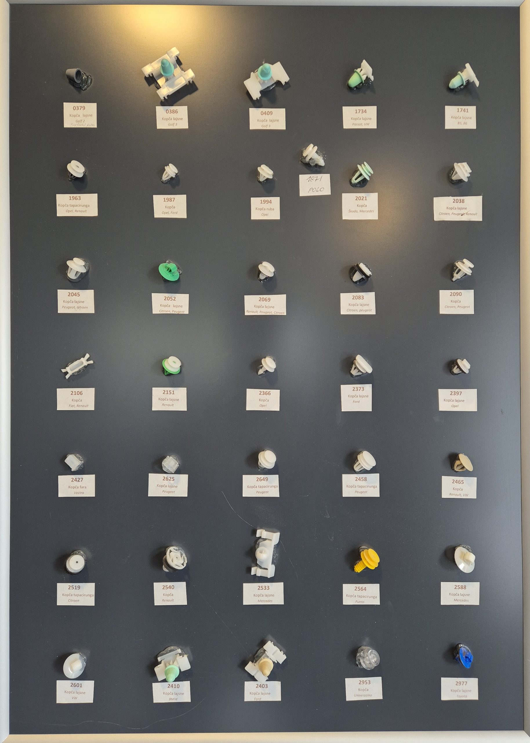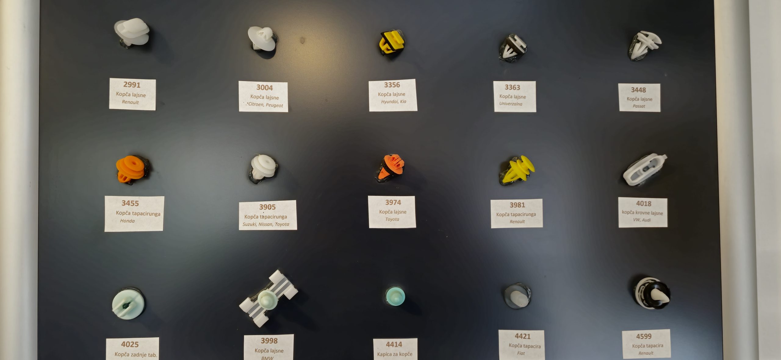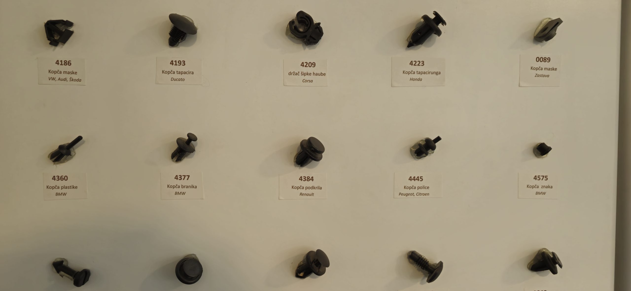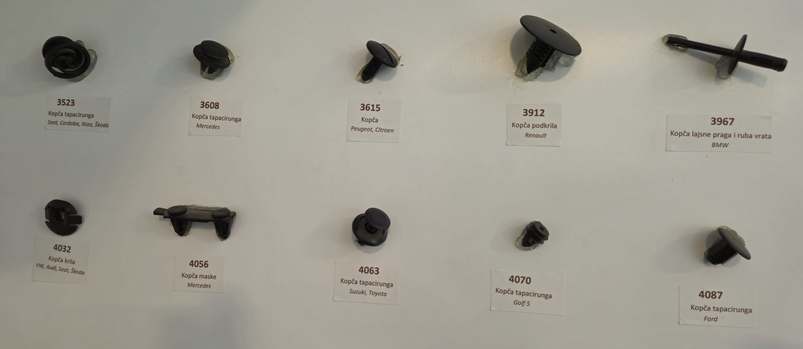 U ponudi imamo preko 300 različitih vrsta plastičnih kopči gotovo za sve marke osobnih i gospodarskih vozila. Kopče su najbolji izbor za spajanje karoserijskih auto dijelova. Osim tipskih kopči za određene marke vozila u ponudi imamo i univerzalne kopče koje se mogu upotrijebiti i za interijere pa se jednostavno mogu pričvrstiti.